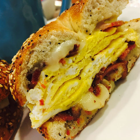 Bacon, sausage, pepper jack cheese and eggs on an everything bagel